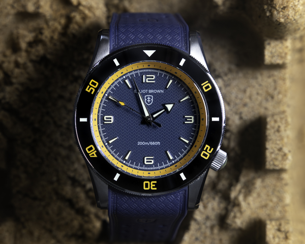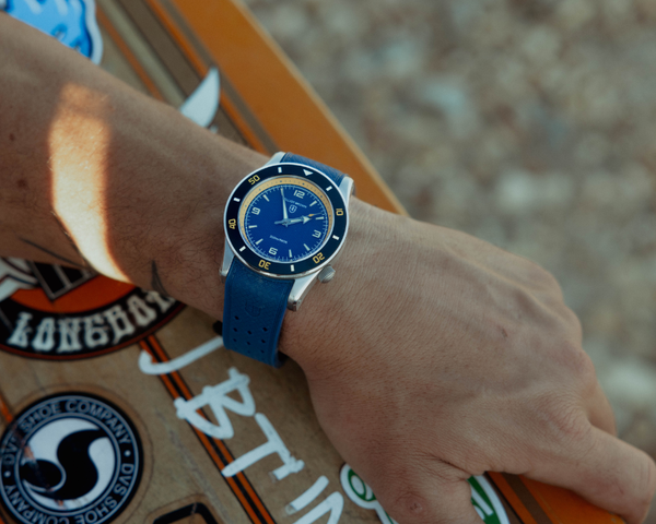 At 40mm with a precise 120-click bezel, it’s equally at home on smaller wrists or worn over a wetsuit. It comes fitted with our signature textured rubber strap and deployant split buckle clasp, but can be easily dressed up with a steel bracelet—or down with one of our ultra-comfortable webbing straps.